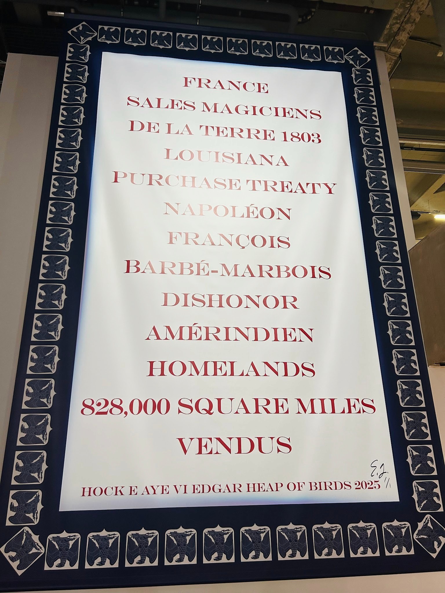 As I further ventured through the exhibition, it became clear to me that this wasn’t a celebration, the Francophone world hosting American art. No, it was studying it, holding it under a microscope and turning it slowly over, observing it the way you observe something you’re trying to understand from the outside. In another room, there was a banner about the Louisiana Purchase rendered as a list of words on a tapestry, while in other rooms, there were boards about abortion in 1980s America. And then there were those jarring pie charts: museum boards, political donations, revenue streams, state by state, hanging across an entire wall like a map of something that usually stays hidden.